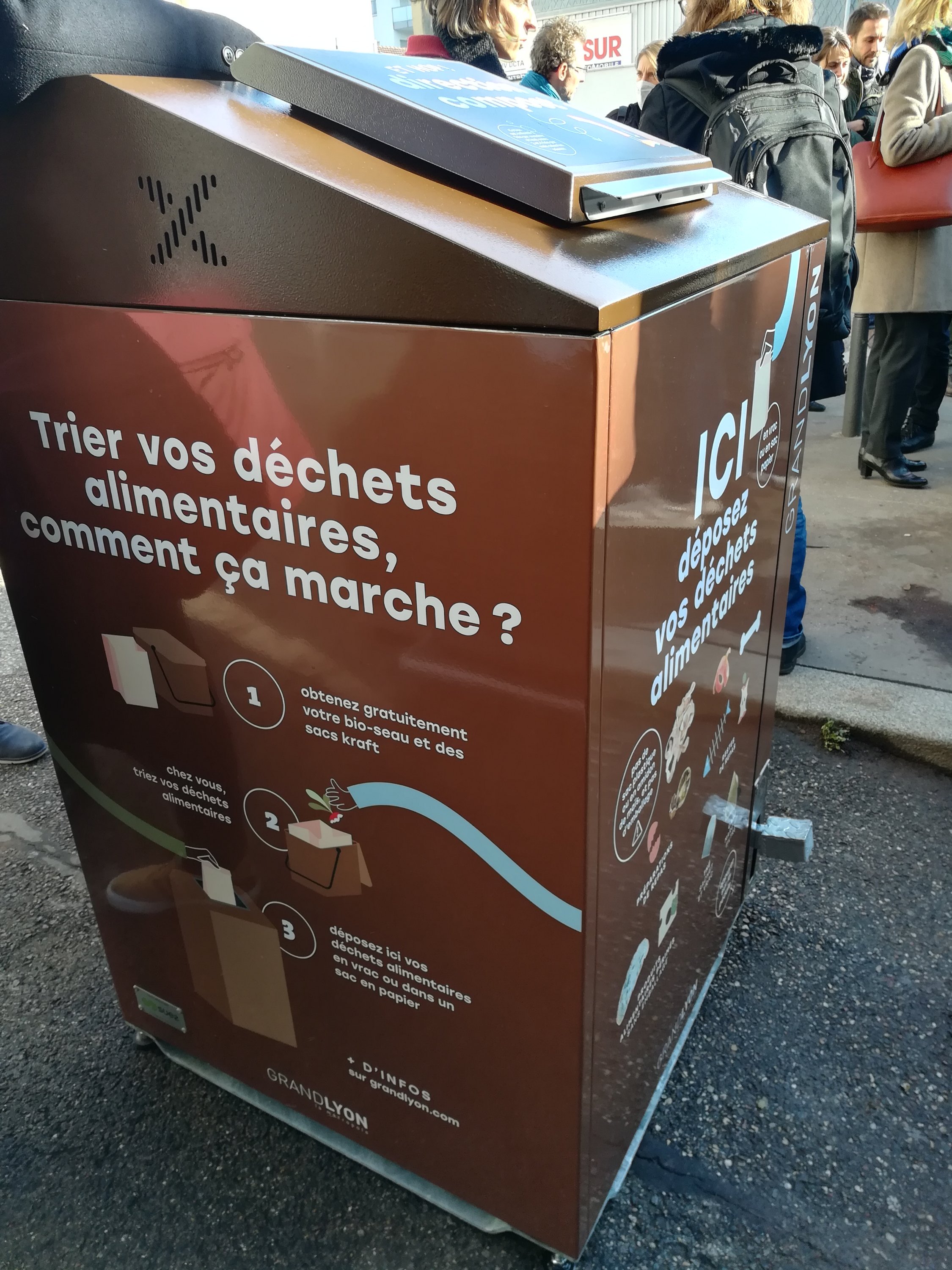 Bruno Bernard , le Président de la Métropole déclare « aujourd’hui nous inaugurons un nouveau service public qui permet aux habitants de composter facilement leurs déchets alimentaires . l’expérience conduite depuis le mois dernier dans le 7e arrondissement de Lyon montre une attente forte de nos concitoyens , ainsi ce sont près de 9 tonnes de déchets alimentaires qui sont récupérés , chaque semaine , dans cette arrondissement , et ce n’est que le début . Avec le soutien de l’ADEME , nous allons progressivement étendre le dispositif à d’autres communes , ainsi en 2023 , l’ensemble des habitants du territoire métropolitain , disposeront d’ une solution de compostage facile et accessible à tous.»