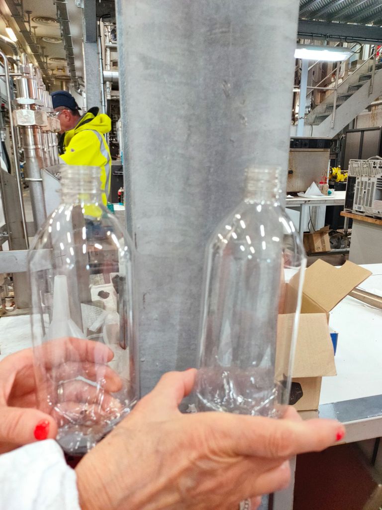 aires du recyclage de plastique, à droite la bouteille originale à gauche une bouteille recyclée, il n’y a pas de différence