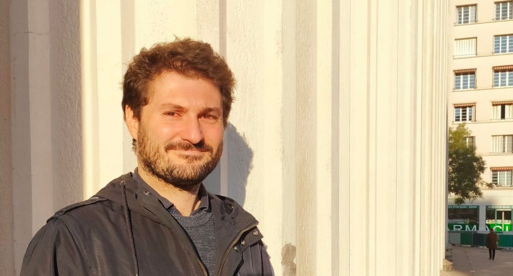 Soleil couchant sur la mairie de Villeurbanne, les colonnes s’illuminent et le sourire de Mathieu en dit long.