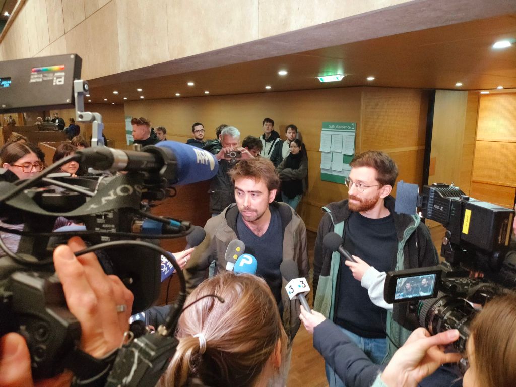 C’était simplement la foule des grands jours, soleil radieux sur le tribunal, et surprise sur la place, une marée de journalistes de caméras, d’appareils photos, attendaient les protagonistes de l’affaire. Marie Alenou journaliste associée au média, ne s’attendait pas à un tel accueil. Et Mauran Kerinec et Pierre Lemerle ont commençé à donner des interviews, dès leur arrivée au tribunal, sur l’esplanade. C’était l’ambiance des grands jours, une foule de caméras et d’appareils photos.